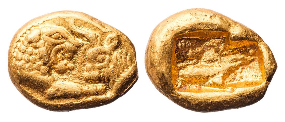 Kings of Lydia. Kroisos (ca. 564/553-550/539 BC). AV 1/6 Stater. Light series. Sardes mint 1.33 gms. Confronted foreparts of a roaring lion right with a tongue of three beads and bull left, rev. Two incuse squares of unequal size. Walberg Group IV, de Traité I 406 = Luynes 2801, Rosen 667. Sharp, lustrous. Choice Extremely Fine.