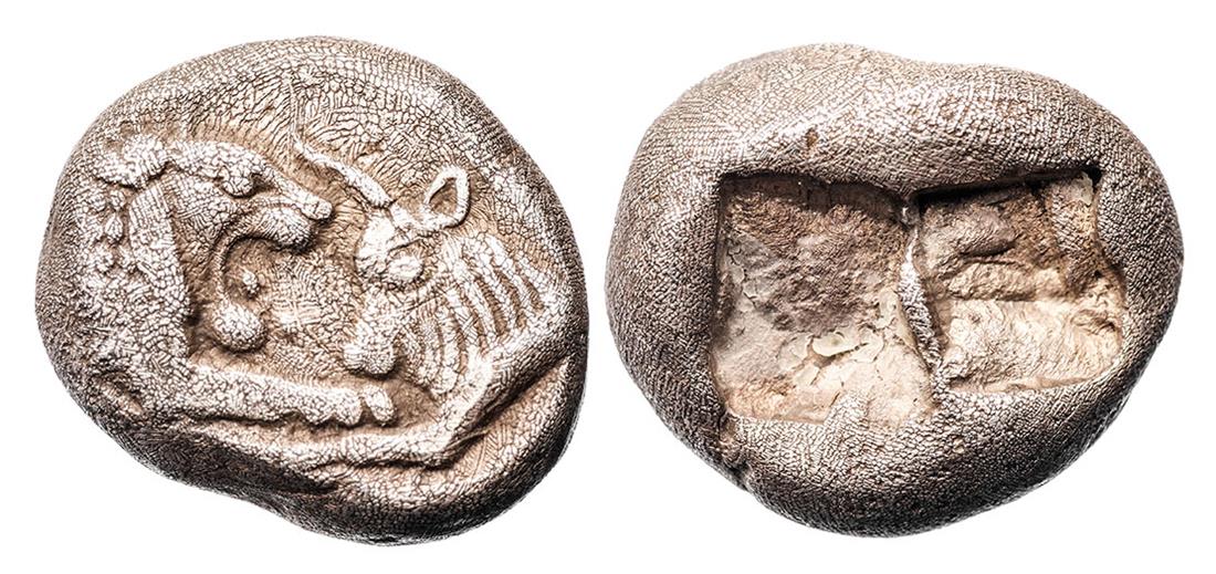 Kings of Lydia. Kroisos (ca. 564/553-550/539 BC). AR 1/3 Stater. Sardes mint. 3.48 gms. Confronted foreparts of a roaring lion right with a tongue of two beads and bull left, rev. Two incuse squares. Traité I 412, Boston MFA 2071. Slightly granular surfaces. Good Very Fine.