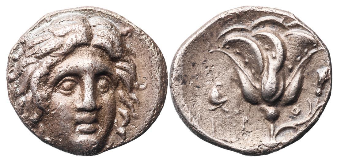 Islands off Caria. Rhodes. AR Didrachm, ca. 275-250 BC. 6.56 gms. Magistrate: Herasikles. Head of Helios ¾ right, rev. EP(AΣIKΛHΣ), Rose with bud right, P-O, Phyrgian helmet in left field. Ashton 187, SNG Copenhagen 738. Toned. Very Fine.