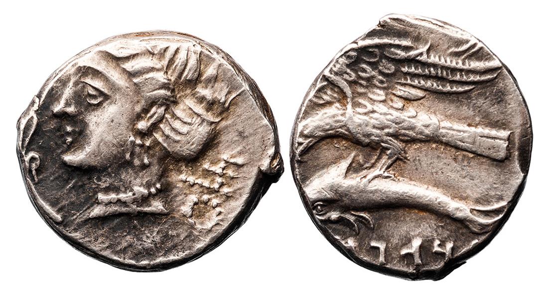 Kings of Cappadocia. Ariarathes I (333-322 BC). AR Drachm. Sinope. 5.41 gms. Head of nymph left, her hair in sakkos, wearing triple-pendant earring and necklace, aplustre at left, M’ in Aramaic at right, rev. Sea eagle flying left, clutching dolphin in its talons, ARYDRT below in Aramaic. Simonetta 6; HGC 7, 434; SNG Copenhagen (Paphlagonia) 290, BMC Black Sea 1459. Very rare, Simonetta notes only six examples, seven pieces are listed in Coin Archives. During the wars of Alexander the Great, Ariarathes, the first king of Cappadocia, took Sinope and there struck this very rare series of coins. After Alexander’s death, Perdikkas appointed Eumenes as governor of Cappadocia, but Ariarathes refused to submit. Perdikkas warred upon Cappadocia. Ariarathes I was defeated, taken prisoner and crucified. Good Very Fine.