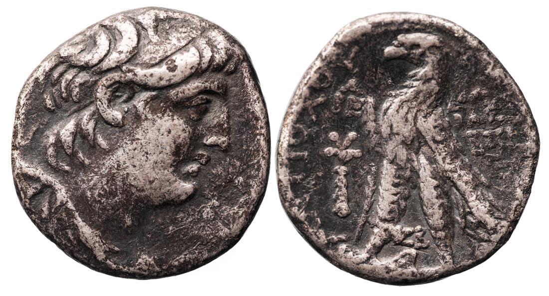 Seleukid Kings of Syria. Antiochos VII Euergetes (Sidetes), 138-129 BC. AR Didrachm, dated SE 182 (131/130). Tyre. 6.35 gms. Diademed and draped bust right, rev. Eagle standing left on ship’s prow, palm frond over shoulder, A/IE and club before, AΣY monogram in wreath above date BПP behind. Rare. Toned over light deposits, old obverse scratches and small pit in field. Very Fine.