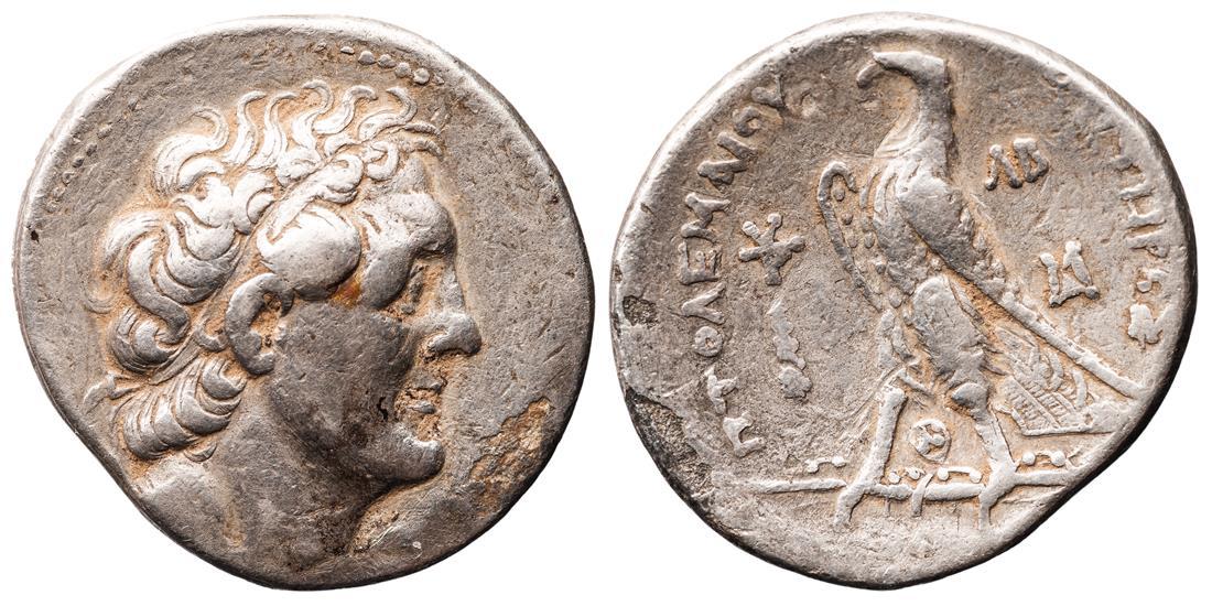 Kings of Egypt. Ptolemy II Philadelphos (285-246 BC). AR Tetradrachm, dated regnal year 32 (254/253 BC). Tyre. 13.64 gms. Diademed head of Ptolemy I right, wearing aegis, rev. Eagle standing left atop thunderbolt, Tyre monogram above club in left field, date ΛB above monogram in right, N in circle between legs. Svoronos 669. Some tooling in obverse field, and some shallow corrosion at edges. About Very Fine.