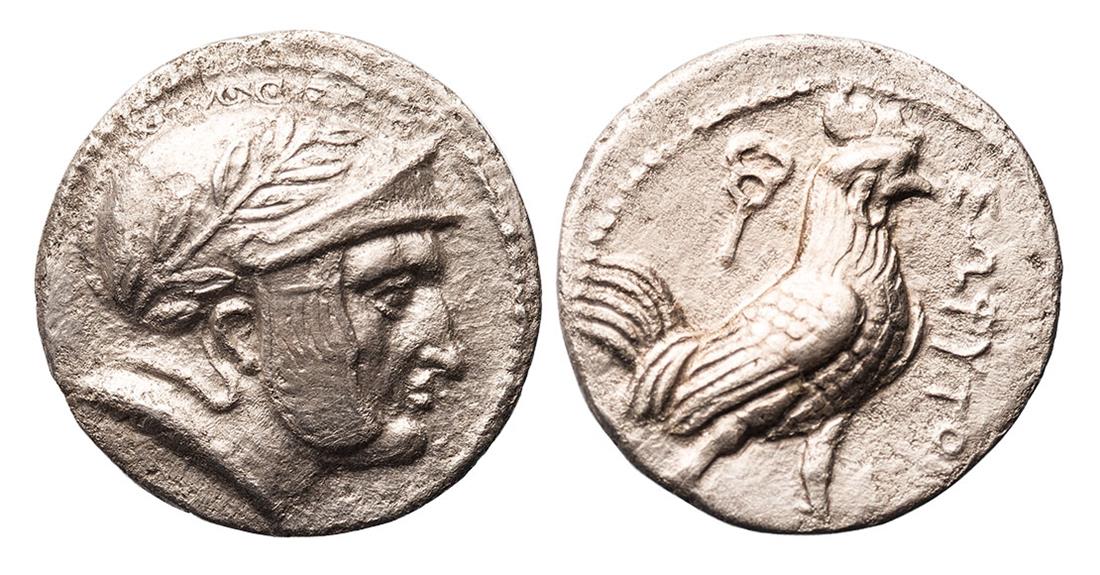 Baktria. Pre-Seleukid Era. Sophytes (ca. 305-294 BC). AR Drachm. 3.41 gms. Male head right, wearing crested helmet adorned with a laurel wreath, cheek-piece decorated with a wing, rev. ΣΩΦYTOY, Cock standing right, caduceus in left field. Bop. Sophytes 3A, SNG ANS 22, MIG Type 29b. The identity and position of Sophytes remain a mystery. But current thought is that he was a local ruler installed ca. 305 BC by Seleukos I during his eastern campaign and war with the Mauryan emperor Chandragupta. Thus this coinage would have been struck prior to the establishment of the Seleukid mints in the area in ca. 294 BC. Slight porosity. Near Extremely Fine and rare.