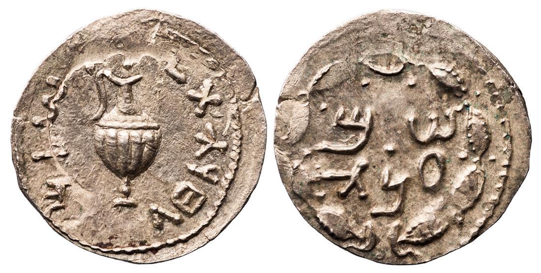 Judaea. Bar Kochba Revolt. AR Zuz – Denarius, undated (Year 3 = 134/135). 3.18 gms. Shim’on in Hebrew within wreath, rev. for the Freedom of Jerusalem around flagon with handle. Mildenburg 132, Mershorer 284, Hendin 1428. Overstruck on an issue of Vespasian, outline of portrait clear on reverse. Well-struck on a broad flan and quite sharp, a superlative example of the type. Extremely Fine.