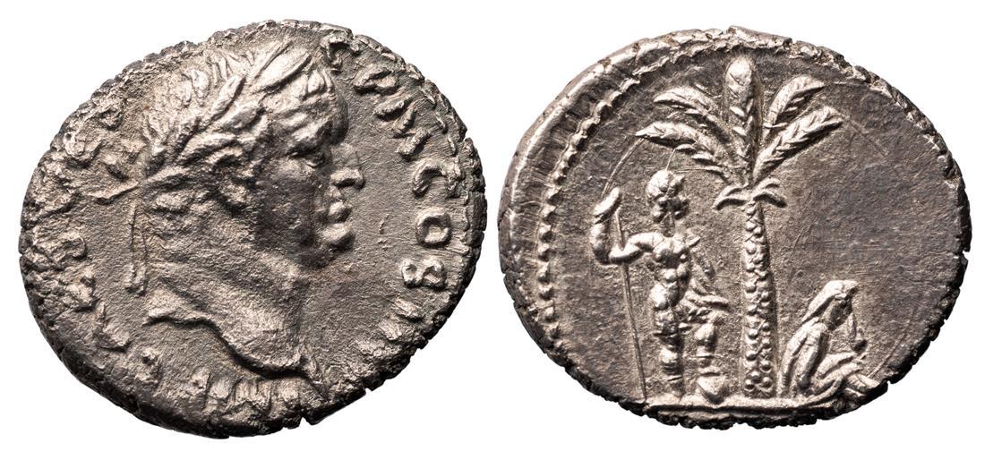 Roman Imperial. Vespasian (69-79). Judaea Capta Denarius, struck 72-73. Antioch. 3.28 gms. IMP CAE VESP AVG P M COS III, laureate head right, rev. The emperor in military attire standing right behind palm tree, holding spear and parazonium, resting foot on helmet, before him at the base of the palm tree, a Jewish woman is seated on the ground mourning. RIC 363, BMCRE 510, RPC 1930, Hendin 763, RSC 645. Usual minor porosity. Sharp reverse details. Extremely Fine.