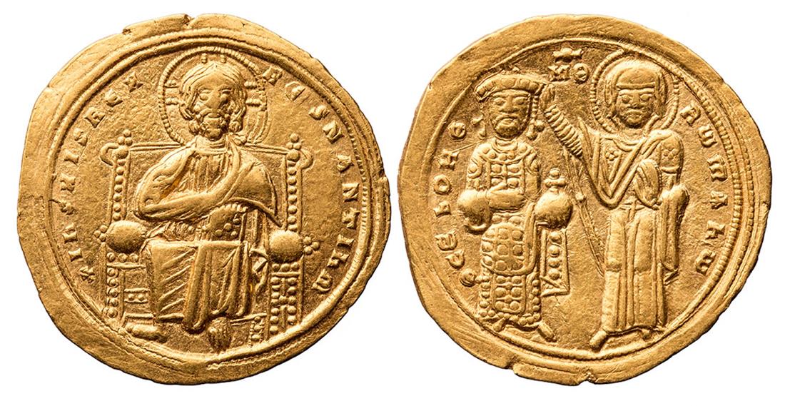 Byzantine Empire. Romanus III Argyrus (1028-1034). AV Histamenon Nomisma. Constantinople. 4.35 gms. Christ Pantokrator enthroned facing, rev. Romanus, hand on chest, holding globus cruciger in other hand, standing facing at left being crowned by the Virgin Mary. DOC 1d, SB 1819. Extremely Fine.