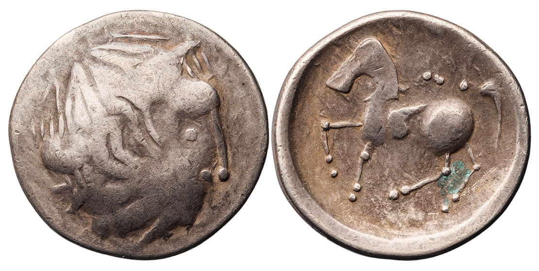 Sextet of Greek Silver and AE. Includes: AR -- Metapontion. Stater, ca. 510-470 BC. Barley ear, META inward at left. Heavy test cut at edge; Eastern Celtic. 2nd Century BC. Sattelkopfpferd Tetradrachm; Euboea, Histiaia. Obol. Nymph head/Nymph on prow. Very Fine; AEs – Ptolemaic AE 36, rough surfaces; Olbian dolphin (verdigris) and Byzantine Follis of Maurice Tiberius. Fine-Very Fine. (6)