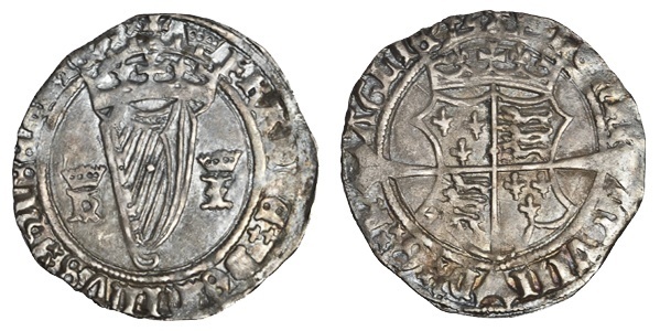 Ireland. Henry VIII (1509-1547). First Harp issue, with Jane Seymour, 1536-1537. Groat. 2.28 gms. Crowned Arms over cross, rev. Crowned harp, flanked by crowned H and I. S.6473. Old toning. Good Very Fine.