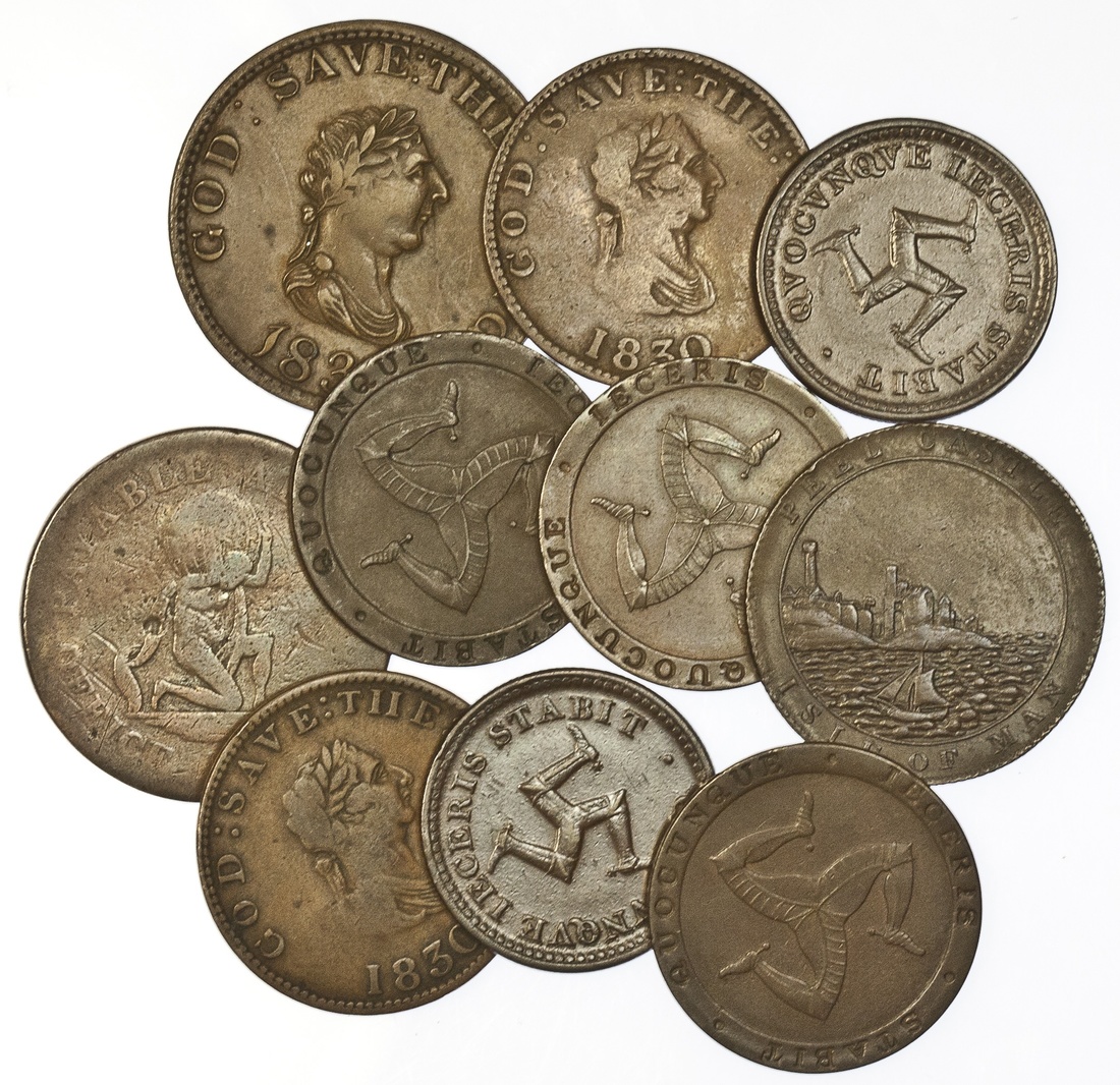 Isle of Man. 19th Century Bank Tokens: Includes 1811 Douglas Penny. Peel Castle. KM Tn8. Good VF; 1811 Halfpennies (2). Triskeles. KM Tn3. VF; 1831 Halfpennies (3). Triskeles. KM Tn21. Good VF-EF; 1811 Atlas kneeling Penny. Good; and 1830 Public Accommodation Halfpennies (2) and Penny. Tn16, Tn18. VG, Fine and VF. (10)