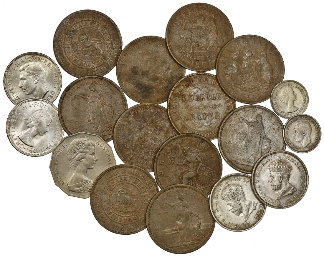 Australia. 19th Century Token Issue Pennies (11). Various. All or nearly all with some surface issue. VG-VF; also 1927 Parliament Florins (2). VF and BU, 1951 Jubilee Florin, and 1954 Royal Visit Florin. Uncirculated, other minors. (18)