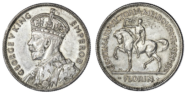 Australia. George V (1910-1936). Florin, (1934). Centennial of Victoria and Melbourne. KM 33. Some very light obverse hairlines. Uncirculated.