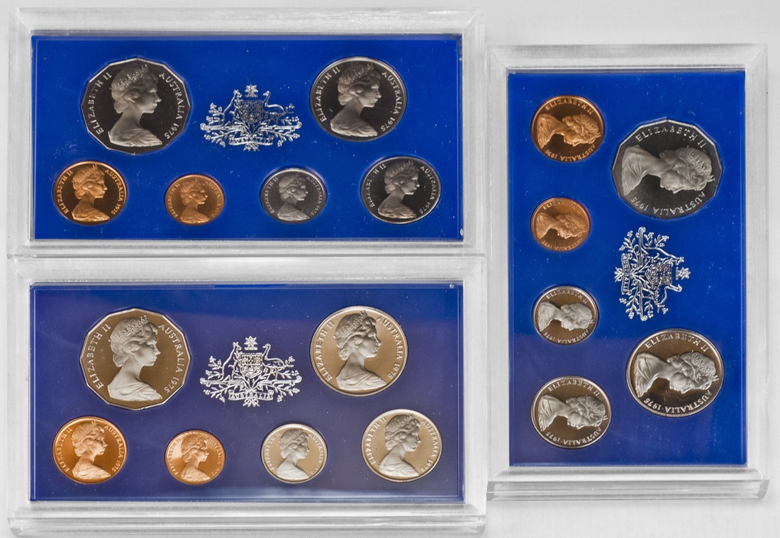 Australia. Trio of 1975 six-piece Proof Sets. One Cent-50 Cents. KM PS37. In original RAM cases. Choice Brilliant Proof. (3 sets)