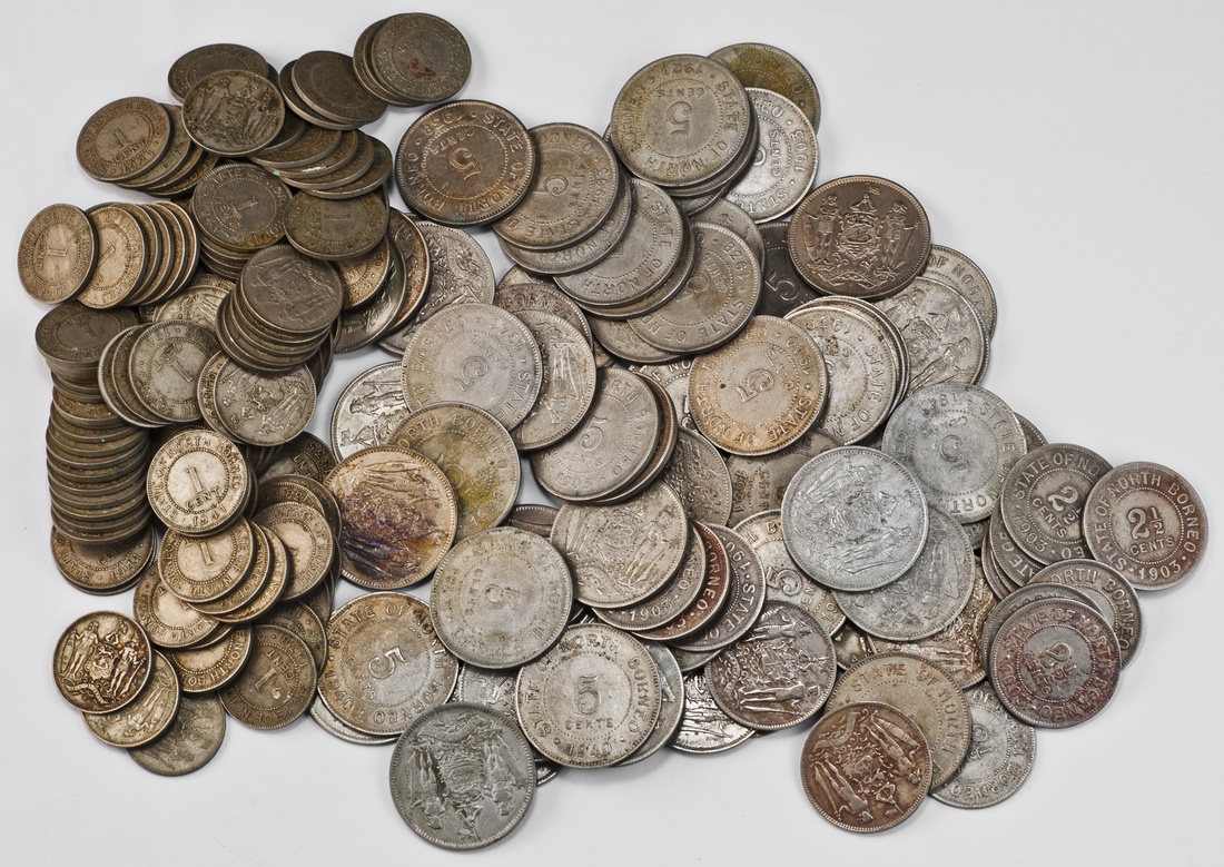 British North Borneo. Large lot of Copper-Nickel Coinage, 1903 H-1941 H -- 5 Cents (70). Generally About VF-EF, 2 ½ Cents (15) VG-Fine; Cents (107). Fine-EF. Arms supported by Dayak warriors. KM 3-5. (192)