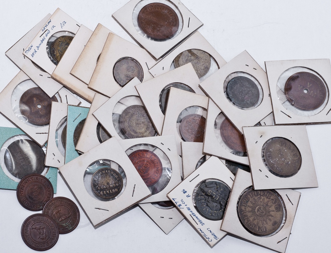 Ceylon. Lot of 19th Century Tokens. Includes issues of Lee Hedges & Co., Colombo Commercial Co., Tatham & Co, George Steaurt & Co (Wekande), M.D.D. & Co., JPJ, J.M. Robertson, J. Allemakkon, Pilo Fernando, S. & Co., Ceylon Co. Ltd, Darley, Butler & Co, A. & B. Scott, FR & Co, N.D.P. Silva, C.H. de S., James Swan & Co., Carey Strachan, two different monogram types. A few with deposits or minor surface issues. Very Good-Very Fine. (28)