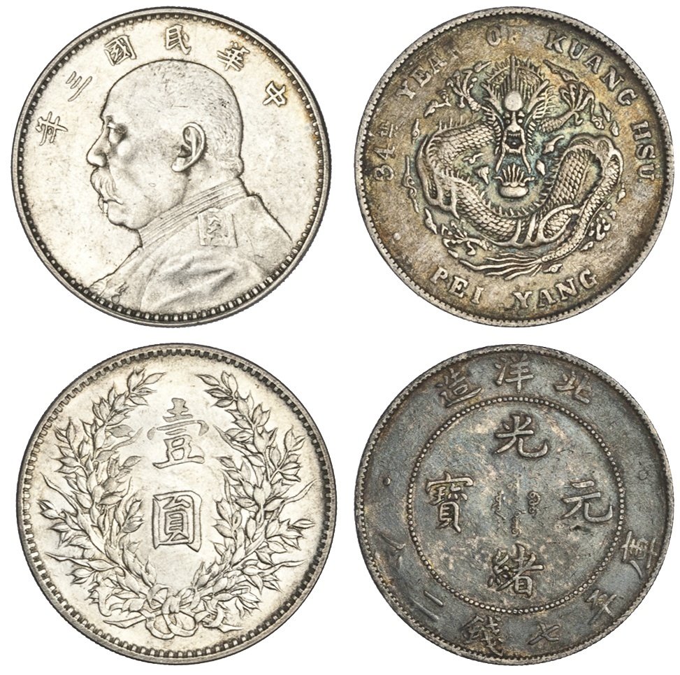 China. Pair of Silver Dollars: Imperial. Chihli Province. Year 34 (1908). Dragon. Y.73.2. Toned. Minor stacking marks; Republic. Year 3 (1914). Yuan Shih-kai bust left. Both About Extremely Fine. (2)