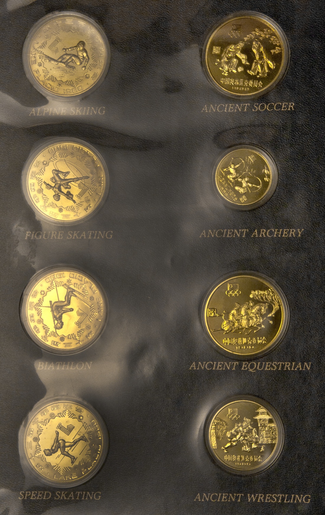 China. People's Republic. Eight-piece 1980 Olympics Jinhuang Brass Proof Set. In original wallet with COA. KM 19-22, 29-32. Brilliant Proof.