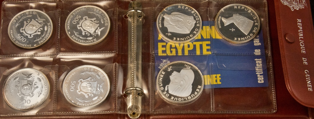 Guinea. Seven-piece "Ancient Egypt" 500 Francs Proof Set, 1970. Depictions of Ikhnaton, Chephren, Cleopatra, Nefertiti, Ramses III, Tutankhamen, and Amenophis IV. KM 22-28. In original red wallet. Brilliant Proof.