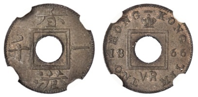 Hong Kong. Victoria (1842-1901). Mil, 1866. Cash-style, four Chinese characters around. KM 3. NGC MS 62 BN.
