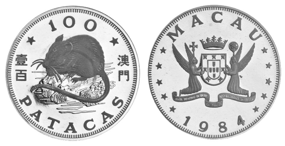 Macau. 100 Patacas, 1984. Year of the Rat. KM 29. In original blue case. Brilliant Proof.