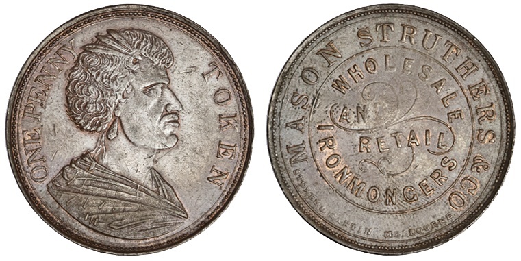 New Zealand. Mason Struthers & Co. Christchurch. Penny Token, nd (1870's). Maori warrior bust right. KM Tn43. Very Scarce. Few surface nicks. About Extremely Fine.