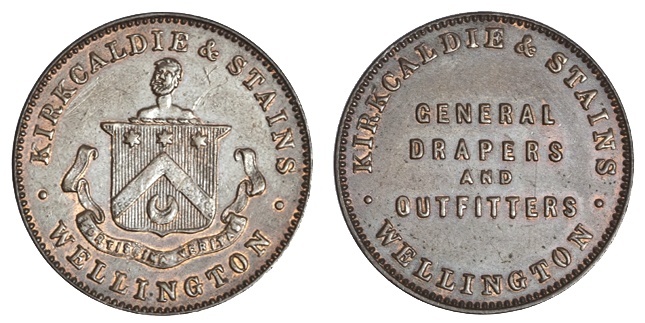 New Zealand. Kirkcaldie & Stains. Wellington. Halfpenny Token, nd (1874). Bust above shield, scroll below. KM Tn36. Small graffiti X and a few pinscratches above shield. Extremely Fine.
