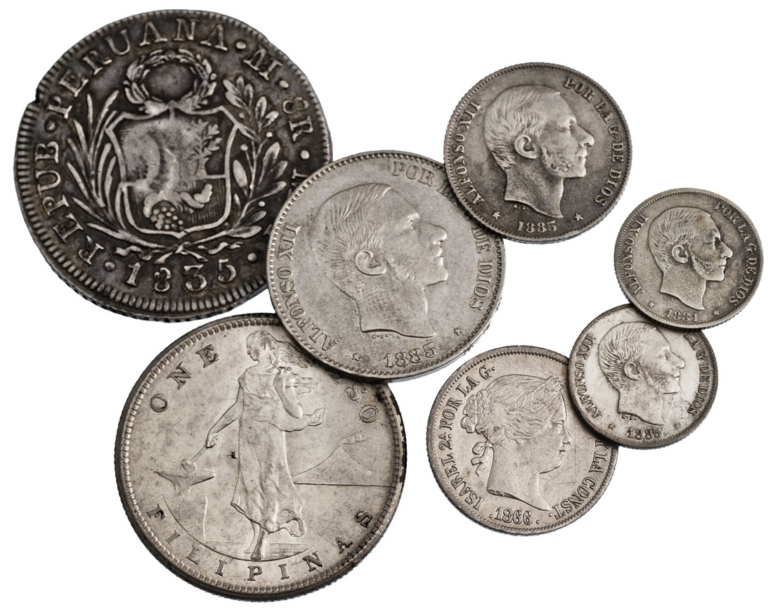 Philippines. Spanish rule-US Administration. Silver septet. 8 Reales (1834-1837). YII c/m on Peruvian 8 Reales, Lima 1835. Toned Good Very Fine; 50 Centimos, 1885; 20 Centimos, 1866, 1885; 10 Centimos, 1881, 1885. Fine-About EF; Peso, 1909 S. AU-Unc. (7)