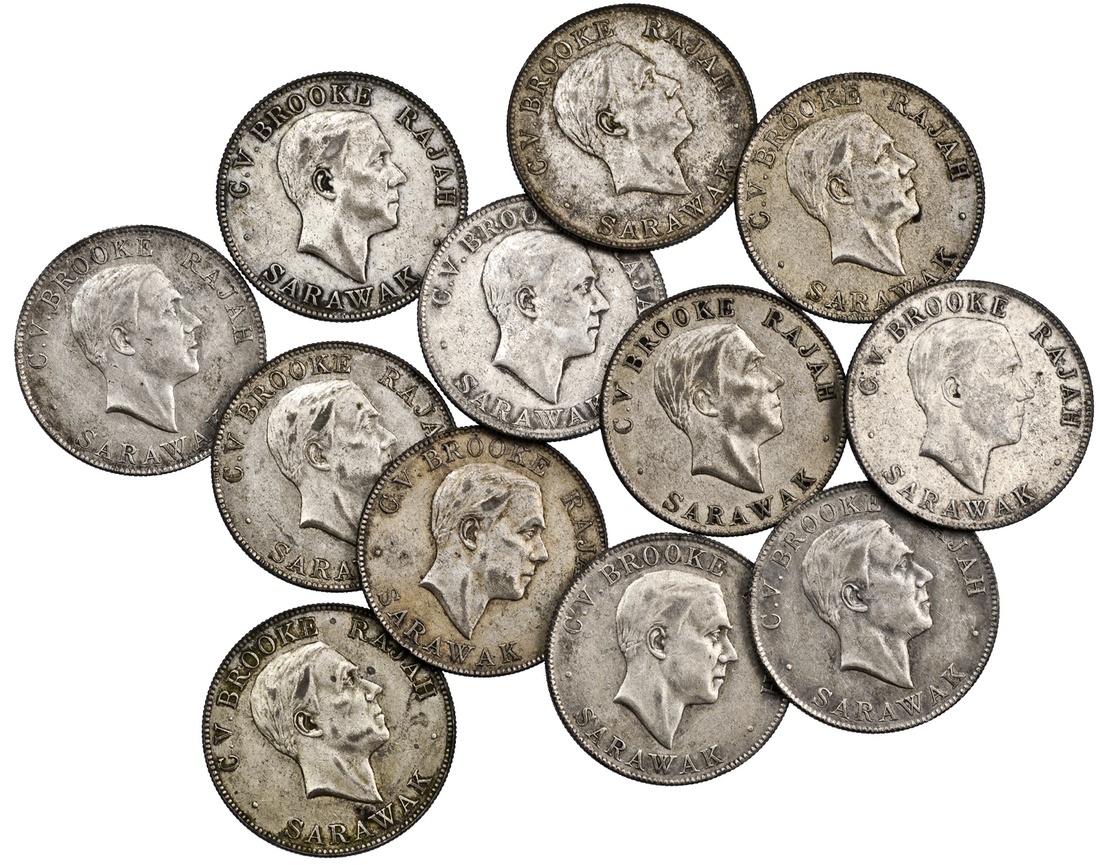 Sarawak. Charles V. Brooke (1917-1946). A dozen 50 Cents, 1927 H. Heaton. Bare head right, rev. Numeral value within roped border. KM 19. About Very Fine-Very Fine. (12)