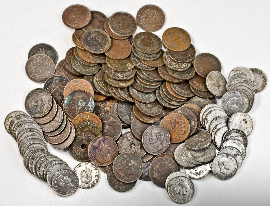Sarawak. Charles V. Brooke (1917-1946). Roll of 10 Cents, 1934 H. Heaton. Bare head right. KM 16. A few with light deposits. About Very Fine-AU, a few better; also Cents -- James Brooke (14), and Charles J. Brooke: KM 6 (79), KM 7 (18) and Half Cents (2). Many with light dirt and deposits. About Very Good-About Very Fine. (163)