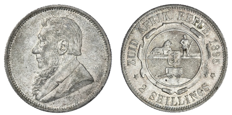 South Africa. Z.A.R. Two Shillings, 1895. Krueger bust left, rev. KM 6. Key date. Some light hairlines in fields. About Extremely Fine.