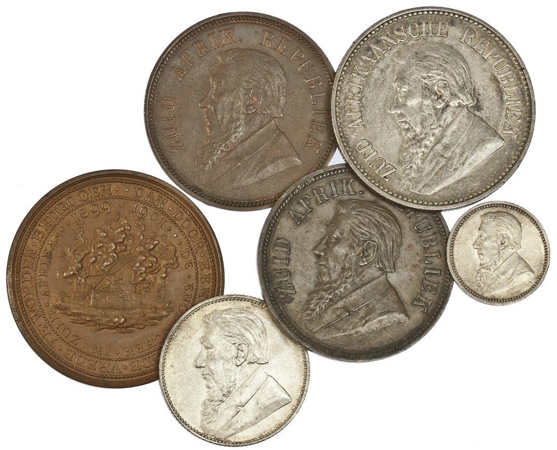 South Africa. Z.A.R. Sixpence and Shilling, 1897. AU-Unc., 2 ½ Shillings, 1896. VF, Pennies, 1892 (some deposits), 1898. VF-EF. KM 2, 4, 5, 7; and Dutch Boer War commemorative medal 1899-1901. Bronze, 34mm. Choice AU. (6)