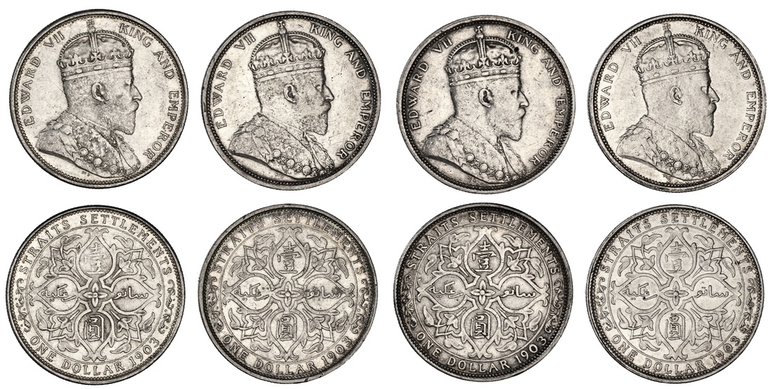Straits Settlements. Edward VII (1901-1910). Quartet of Dollars, 1903. Crowned bust right, rev. Value in Chinese and Malay-Persian on fancy cruciform cartouche. KM 25. About Extremely Fine-Extremely Fine. (4)
