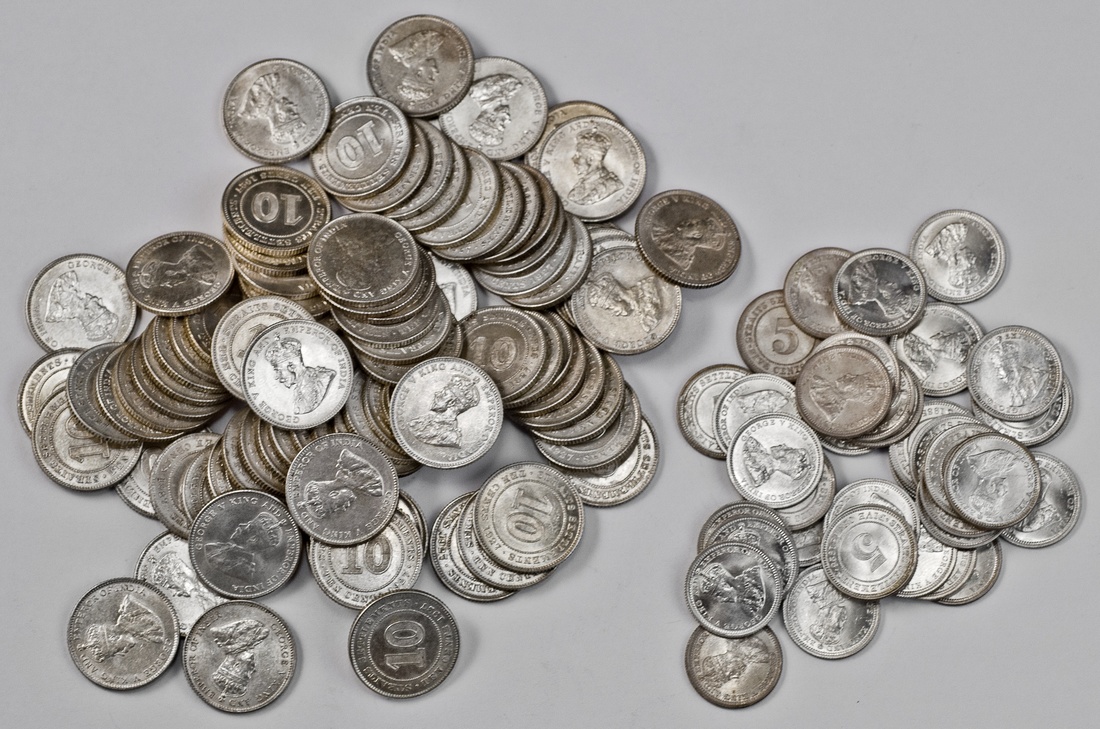 Straits Settlements. George V (1910-1936). Group of 10 Cents, 1927 (89). Crowned bust left. KM 29b. EF-Uncirculated; and 5 Cents, 1926 (9), 1935 (28). KM 36. (126)