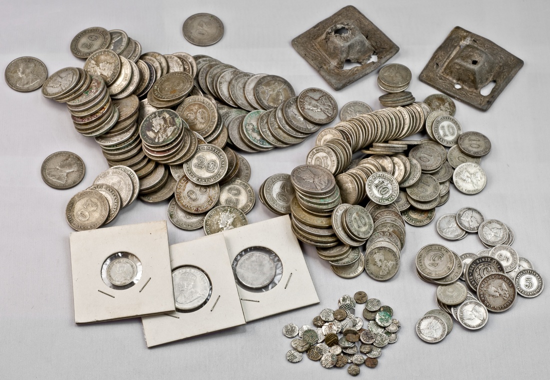 Straits Settlements. George V (1910-1936). Lot of Silver Minors. Includes: 50 Cents (4), 20 Cents (110), 10 Cents - generally, if not all, 1927 (106), and 5 Cents (23); also Victoria 10 Cents, 1920 Nickel 5 Cents (6), and two examples of Tin Hat Money (one with tinpest and surface loss). A few with deposits. Very Good-Very Fine; and Indian silver chuckrams (45+). (297)