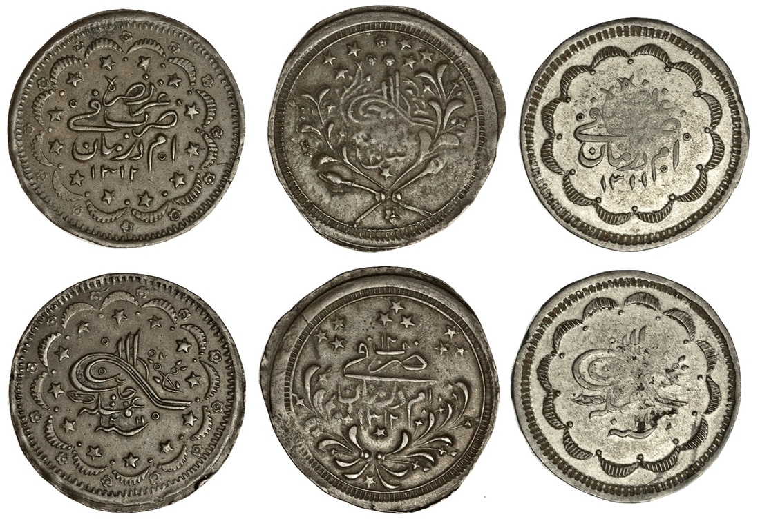 Sudan. `Abd Allah b. Muhammed, the Khalifa (AH 1302-1316/1885-1898 AD). Trio of Billon 20 Qurush (Piastres): Omdurman, AH 1311, year 11. Toughra in border of crescents, rev. `azza nasrahu above mint and date in crescent border. KM 16. Weakly struck centers as usual, small obverse lamination. Very Fine; Omdurman, AH 1211-1312. 20.24 gms. Toughra in crescent and stars border, date "12-11" below, rev. `azza nasrahu above mint and date in crescent and stars border. KM 14 (unlisted obverse date). Rare. Extremely Fine; Omdurman, AH 1312 year 12. Toughra in wreath above crossed spears. KM 26. Weak obverse center, Very Fine. (3)