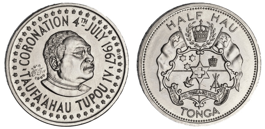 Tonga. Taufa'ahau Tupou IV (1967-2006). Palladium Half Hau, 1967. Coronation issue (KM 23) c/m on obverse 1918/TTIV/1968 for the king's fiftieth birthday. KM 24. Very rare, only 513 pieces issued. With original red case. Brilliant Uncirculated.
