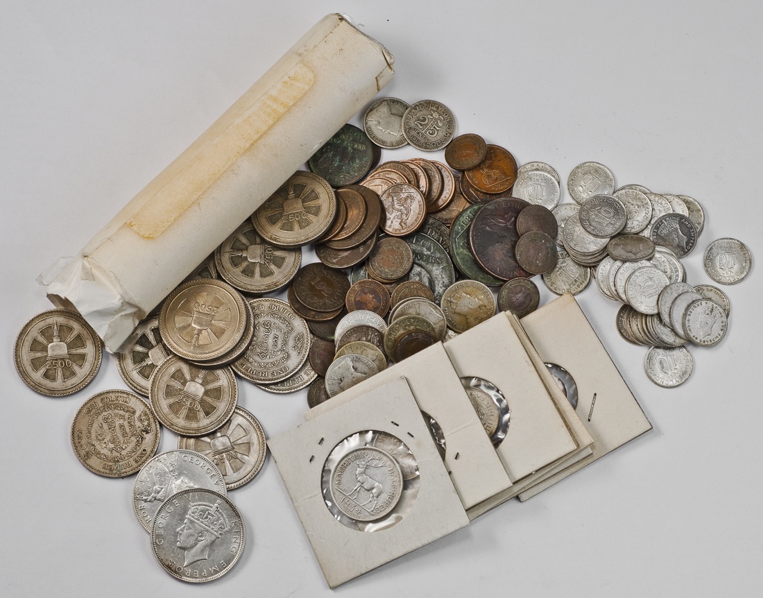 Mixed lot of Ceylon and Mauritius coinage: Ceylon. George III AEs (13), other AEs (19). Some with light deposits or light porosity; Fine-EF; British type Half Farthings, 1837 for use in Ceylon (13). Mostly with light surface porosity and/ or stain, VF-EF; Uncirculated 10 Cents, 1941 (47); other silver minors (12); also roll+ of Buddhism commemorative 1957 Rupees; Mauritius. Rupees, 1934, 1938; Half Rupee, 1934, Quarter Rupees, 1936, 1946. EF; and Victoria silver minors (2). Fine. (161)