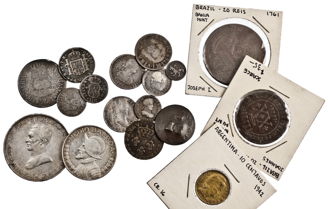 Lot of Latin American Minors. Spanish Colonial -- Bolivia. Real, 1825 JL; Guatemala. ½ Real, 1813 NG M, ¼ Real, 1821 G; Peru. Real, 1769, 1808 JP, ½ Real, 1819 JP; Mexico. 2 Reales, 1771 F, Real, 1809 TH, ½ Reales, 1746 M, 1815 JJ; and Uruguay Peso, 1917; Panama ½ Balboa, 1933, AEs (3); also Tobago. Black Dog. "TB" c/s on Stampee (on 1769 French issue) and Cayenne. 2 Sous, 1786 A. Generally Very Good-Very Fine. (17)