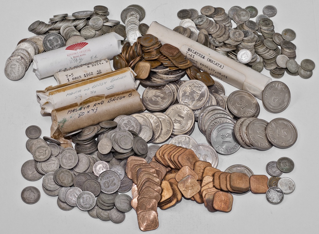 Malay Assortment. Includes: Malaya. George VI. Silver 20 Cents (33), Silver 5 Cents (300+). VF-Unc.; ½ Cents (50). KM 1. Fine-EF; 1 Cent, 1945 (60). KM 6. BU; copper-nickel issues (140); North Borneo. 25 Cents, 1929 H (5). About Fine-Fine. Some porosity; Malaya & British Borneo. 20 Cents (150), Square Cents (80+), 1962 Cents (50). VF-Unc.; Singapore. Dollars, 1968 (37). Unc. (Approx. 905)