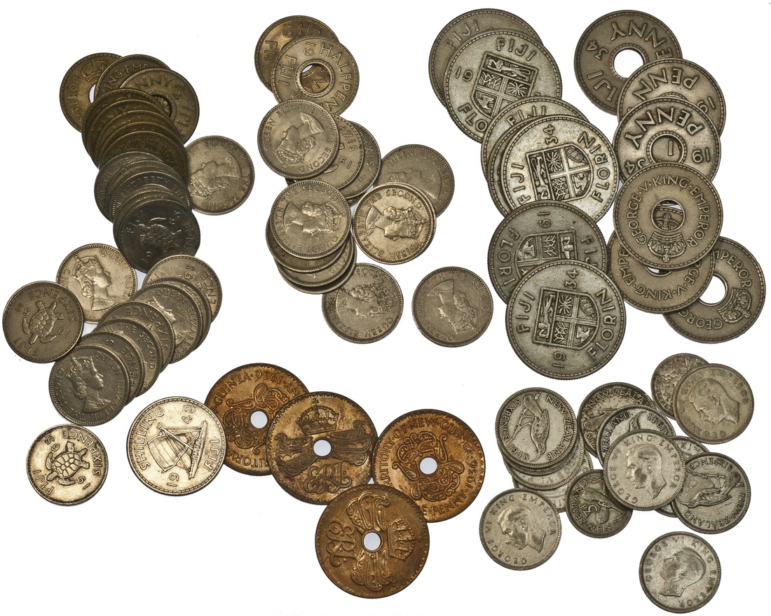 Medley of New Guinea and Fiji coins: New Guinea. Sixpence, 1943 (19), 1935 (2), Threepence, mostly if not all 1944 (98). A few with deposits, Fine-EF; Pennies, 1936. KM 6. AU-BU (77), VF-EF, some with deposits (30); Fiji. Florins, 1934-1936 (45). About VF-EF; Pennies, 1934 (25); ½ Pennies, 1943 (27). F-EF, 1952 (35), 1954 (58). AU-Unc.; 1942 Shilling and misc. copper-nickel; also New Zealand silver minors (26). (Approx. 490)