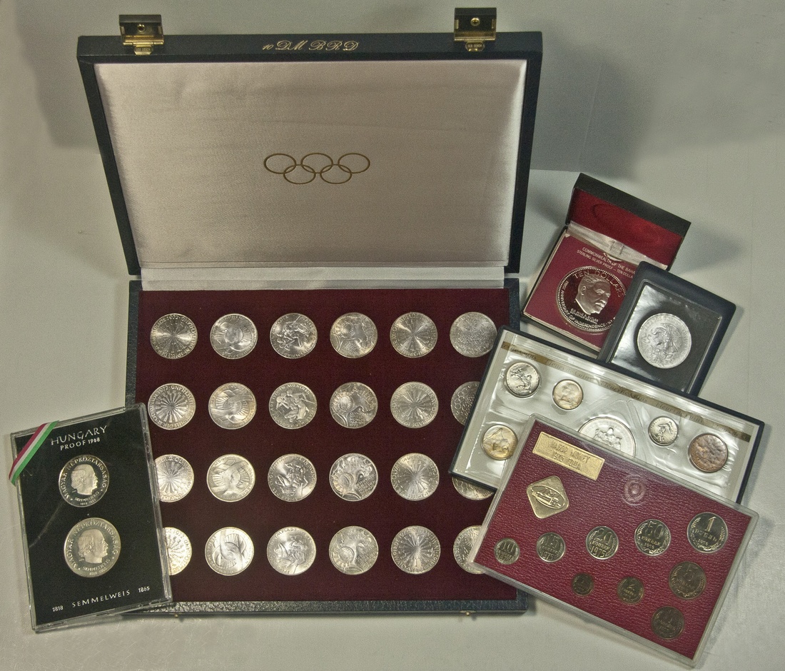 Assorted World Coin Sets and Pieces: Bahamas. 1974 $10 Proof; France. 1976 Fleur de Coins Set; Germany. 1972 Munich Olympic Coin Set (24 coins); Mexico 1968 Olympic 25 Pesos; Hungary 1968 Proof 50 & 100 Forint; Soviet Union. Proof-Like Coin Sets of the Soviet Union 1974-1980.