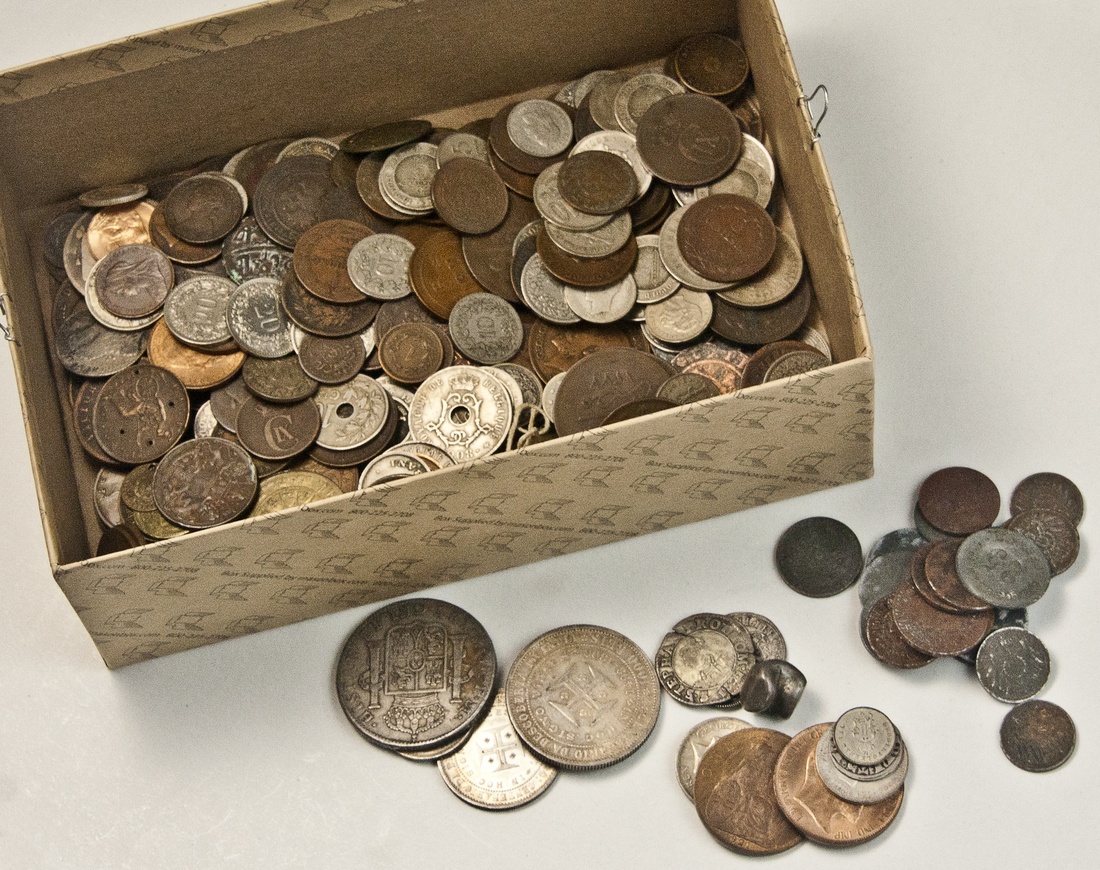 Potpourri of World Coins. Mostly European, some Asian and Latin America, largely 19th-20th Century; the greater portion AEs, but silver too --including Portugal Commemorative 1000 and 500 Reis, 1898. EF; Straits Settlements 20 Cents, 1899. VF-About EF; Mexican 8 Reales, 1799 Mo FM; Metz, 1621 6 Gros, Fine-About VF; 1728 Spanish Real Sevilla, EF; a bullet money Baht, a medieval Low Countries coin and others. A few holed or with problems. Good-Uncirculated. (220+)