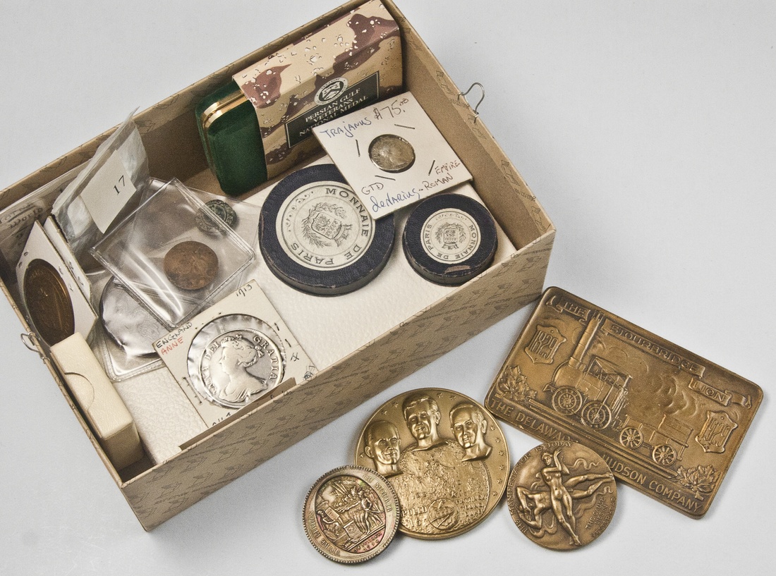 World Oddments and US Exonumia. Includes French Monneron Freres 1792 5 Sols, Choice EF; British Queen Anne Halfcrown, 1713, Panama 1947 Balboa, British EII Sterling Silver Jubilee Medal; a few lower grade Roman coins and others. About VG-Uncirculated; two different 904 St. Louis Expo Bronze Medals, 250th Anniversary Arrival of Penn Medal, and a handful of modern bronze medals. EF-Uncirculated. (22)
