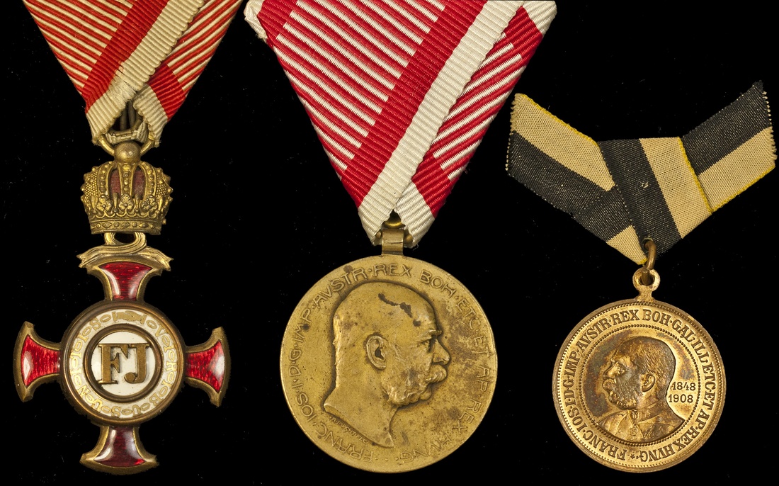 Austro-Hungary. Trio. Order of Franz Josef. Cross of Merit. Breast badge. Gilt Silver and enamels. By K. Bohm. Gilt lettering on white enamel centers. On ribbon. EF; Bosnia-Hergovina. Franz Josef 60th Anniversary of Reign, 1908 Medal. On ribbon. VF; and small brass medalet for the 1908 Jubilee. AU. Ex Ted Belich Collection. (3)