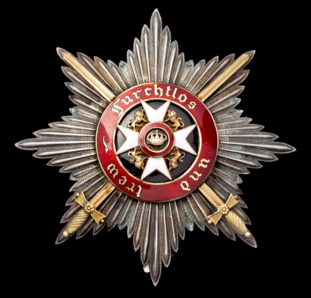 German States. Württemberg. Order of the Crown. Military Division. Grand Cross Breast Star. Silver, gilt and enamels. 82mm. By Eduard Foehr, Stuttgart. Central medallion with gold crown on circle of black and red enamel gilt-lined on white enamel cross, gold lions in angles, "furchtlos und trew" in gold letters on red enamel around, crossed gilt swords behind. All on radiant plaque, maker's name on backplate. Pinback. Minute loss of black enamel on small central circle, otherwise Choice.