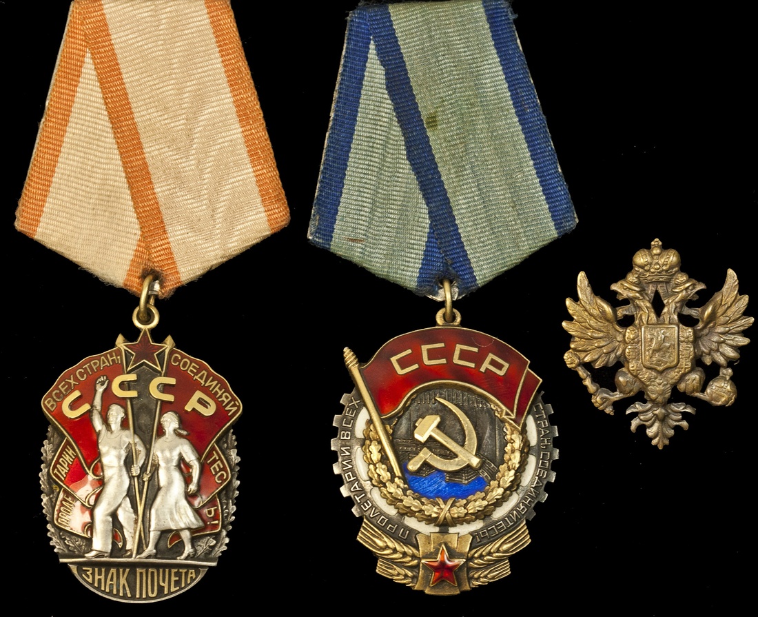 U.S.S.R. Pair - Order of the Red Banner of Labor. No. 211422; and Order of the Badge of Honor. No. 369998. Both on ribbons with plaque. Extremely Fine; also small Imperial Eagle badge. Brass. VF. Ex Ted Belich Collection. (3)