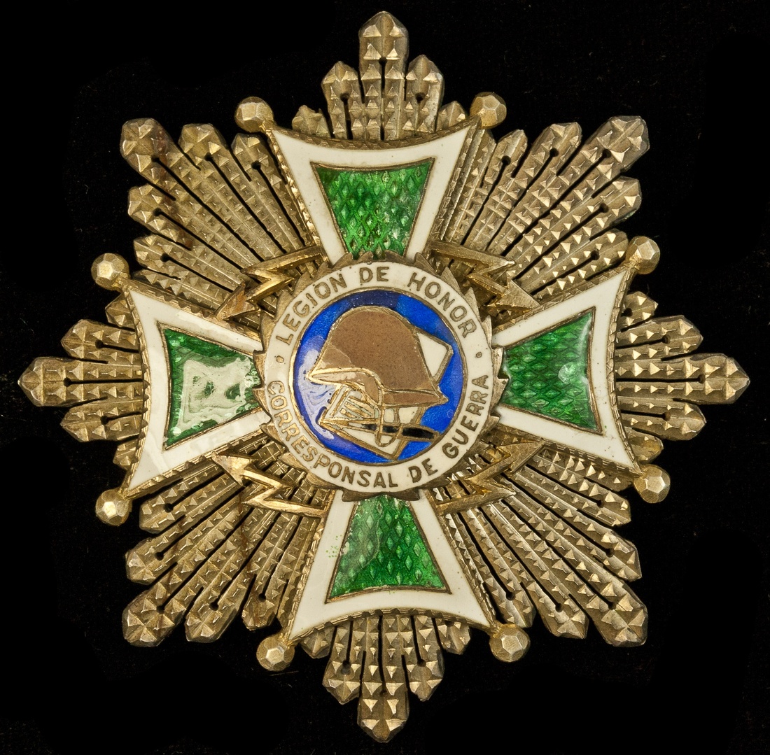 Spain. War Correspondent's Legion of Honor Badge. Spanish Civil War Period. Silver and enamels. 63.5mm. Helmet, book and stylus on blue enamel center, legend around against white enamel, set on green enamel cross with white borders, all on rayed plaque. Pinback with side hooks. Extremely Fine.