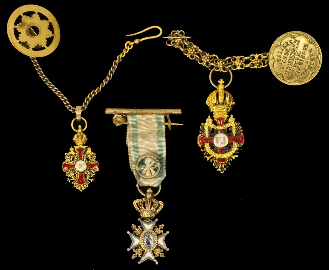 Trio of Miniatures: Austria. Order of Franz Josef (2). Gilt, gold and enamels -- ring and chains possibly gold. One with additional uncertain openwork badge (hallmarked VM), the other, larger, with maker's badge - Hemmerle of Munich; and Serbia. St. Sava. Silver, gilt and enamels. Good VF-Choice Extremely Fine. (3)
