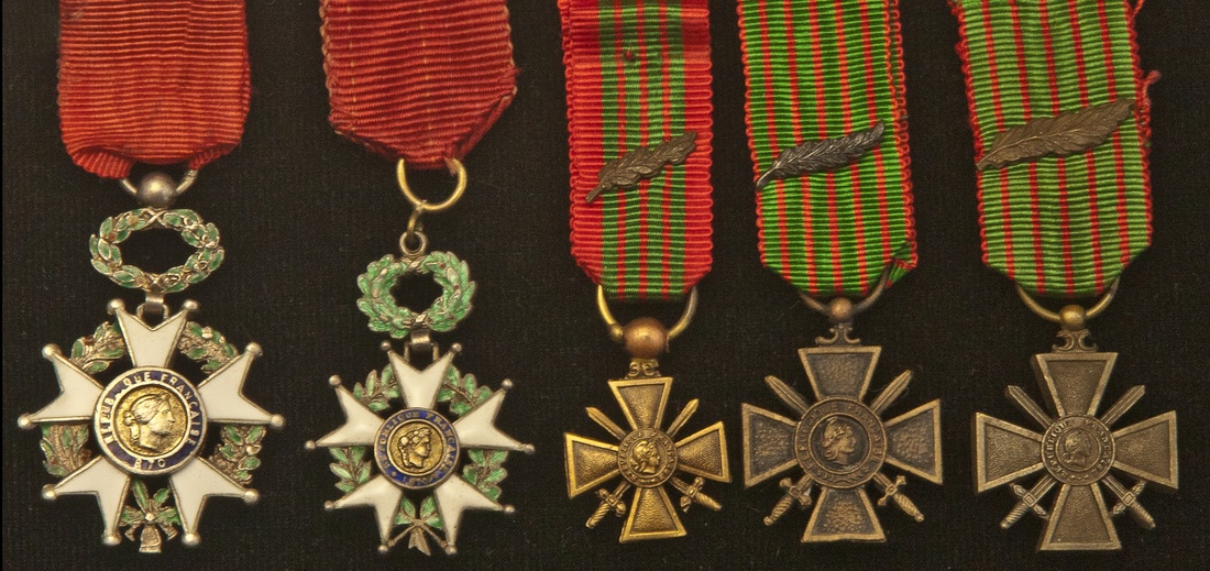 France. Quintet of Miniatures: Order of the Legion of Honor, Third Republic (2). Silver and enamels; and Croix de Guerre, 1914-1916, 1914-1918, and undated - all with single palm. Very Fine-Extremely Fine. (5)
