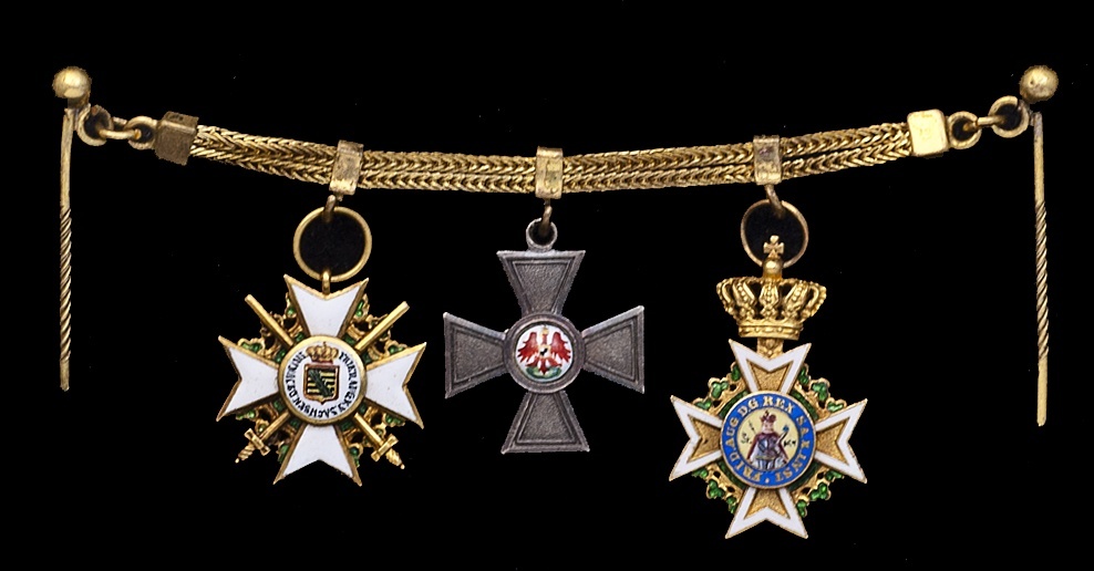 German States. Trio of Miniatures on gold sweetheart brooch pin: Saxony. Military Order of St. Henry. Badge. Gold and enamels; Prussia. Order of the Red Eagle. Badge. Silver and enamels; Saxony. Order of Merit. Military Badge. Gold and enamels. Gold - untested. Pleasing. Extremely Fine.