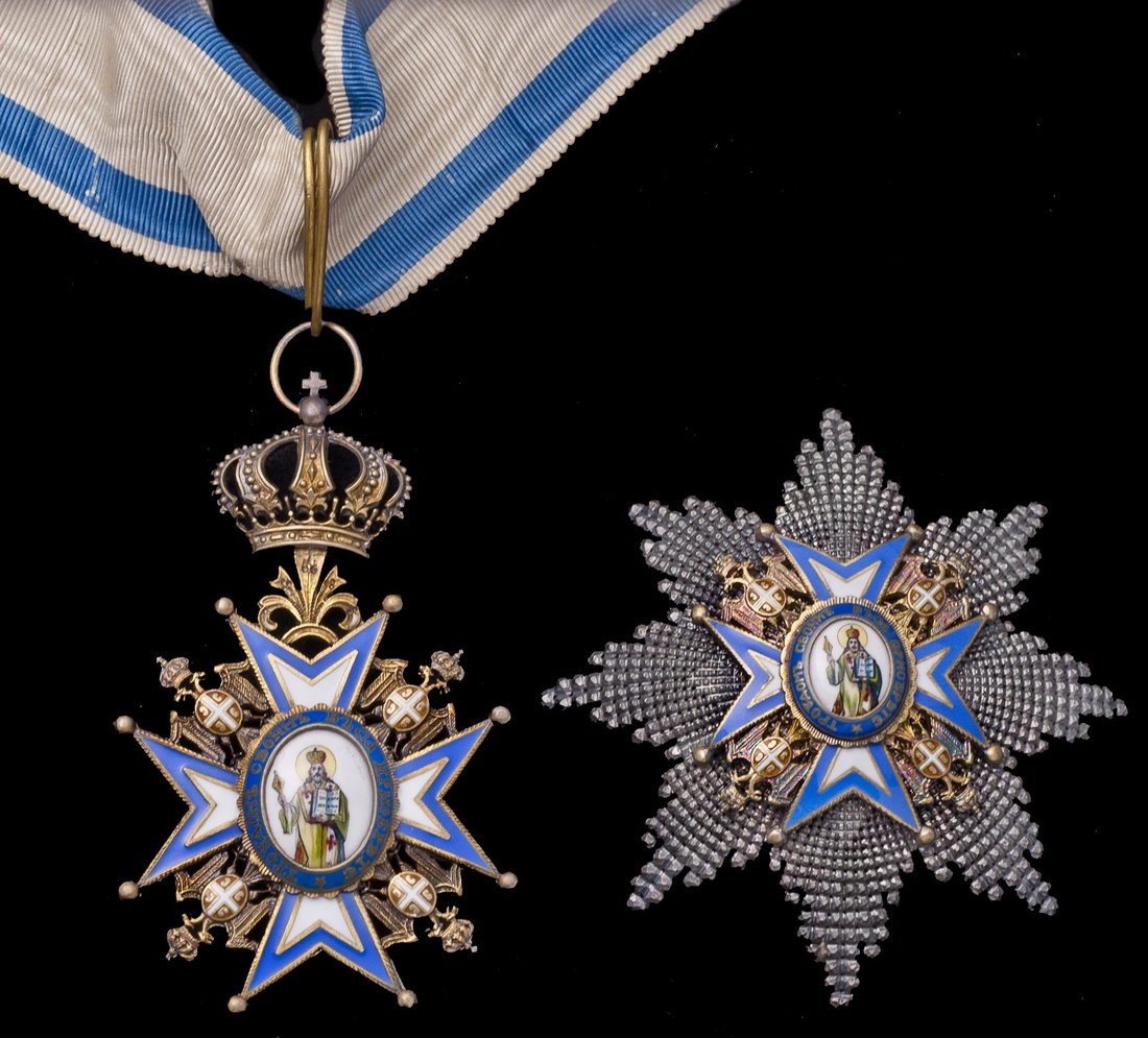 Serbia. Order of Saint Sava. Grand Officer's Set. 2nd Class. Silver, gilt and enamels. By Sorlini, Varazdin. Sash Badge, 85mm (from tip of crown suspender) and Breast Star, 82 x 78mm. Cross: St. Sava in multicolor enamels with green robes on medallion at center of central cross framed in blue and white enamel, Arms on double-headed eagle in each angle. "1883" in wreath on back of Cross. In original Sorlini case. Extremely Fine and well-preserved.